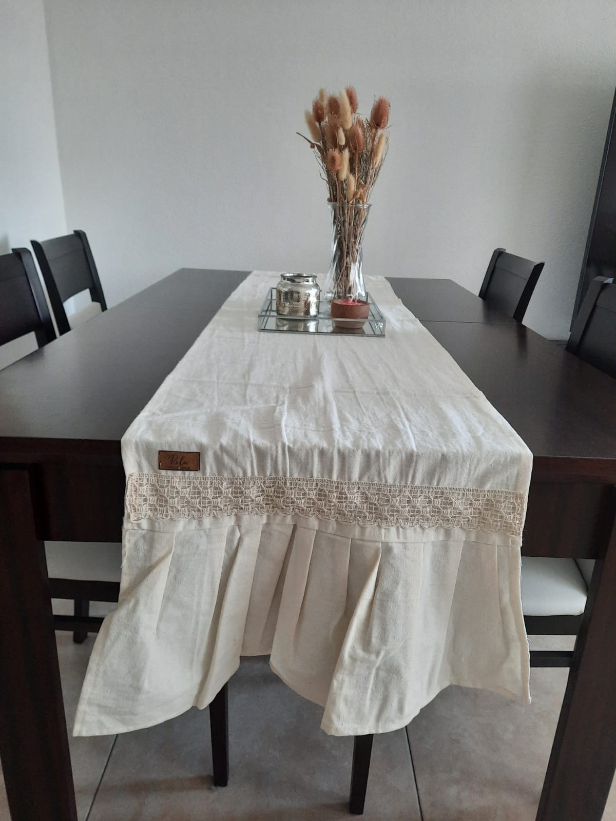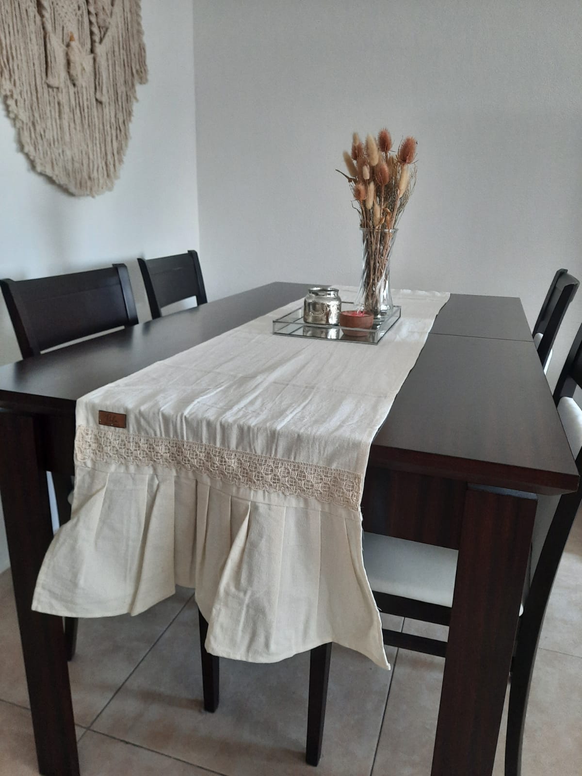 Realizado en Tusor, 100% algodon. Con volados en sus extremos. En dos tamaños. Color Crude.